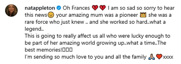 Penyanyi All Saints Nicole Appleton menulis: 'Frances, saya sangat menyesal mendengar ibu hebatmu telah pergi. Dia adalah bagian penting dalam hidup saya dan membuka jalan bagi banyak dari kami! Mengirimkan cinta yang sangat kepada kalian semua.'