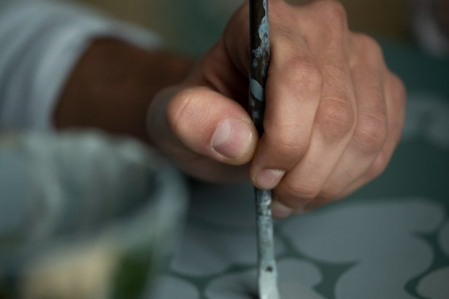 Q: Ketika menerapkan simbol-simbol Anda pada berbagai medium — kanvas, batu, kain — bagaimana Anda menyeimbangkan kebebasan dengan tujuan?